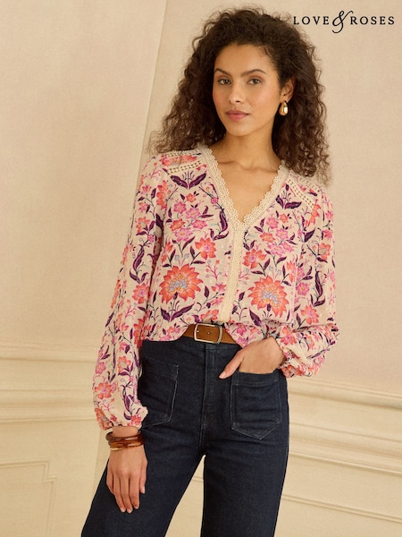 Love & Roses Ivory Floral Print V-Neck Lace Long Sleeve Dobby Blouse