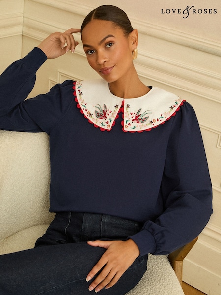 Love & Roses Navy Woven Collar Embroidered Sweat Top