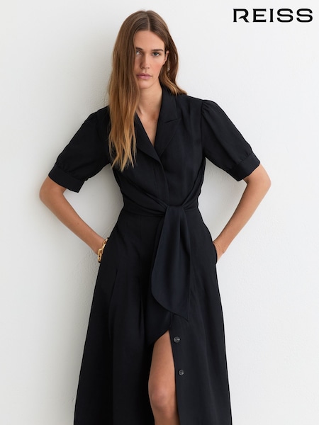 Reiss Navy Tessera Short-Sleeve Belted Midi Dress with Linen