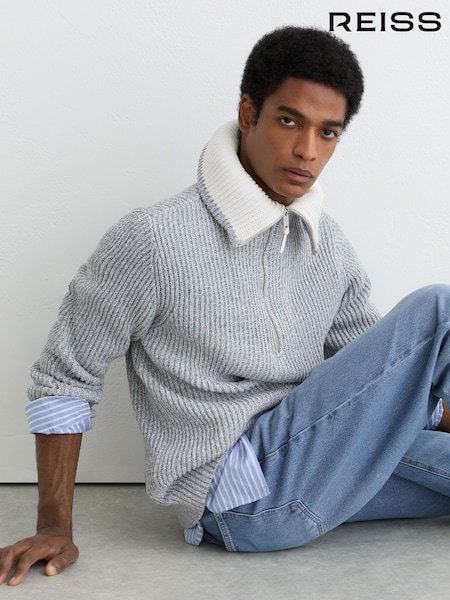 Reiss Oatmeal Melange Prop Cotton-Blend Rib Half-Zip Polo Jumper