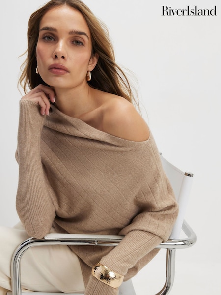 River Island Brown Long Sleeve Bardot Ribbed Jumper