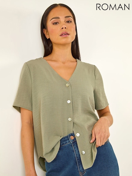Roman Green Petite V-Neck Button Through Blouse