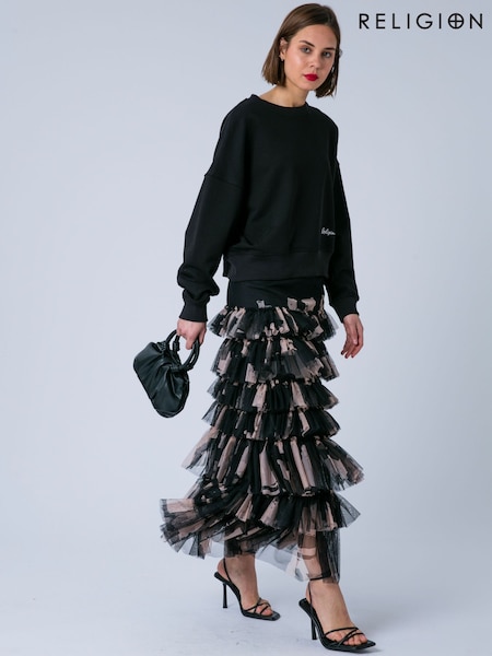 Religion Black Myla Maxi Skirt In Soft Tulle Layers In Abstract Façade Print