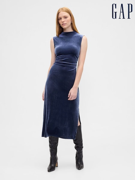 Gap Blue Ruched Velvet Mock Neck Midi Dress