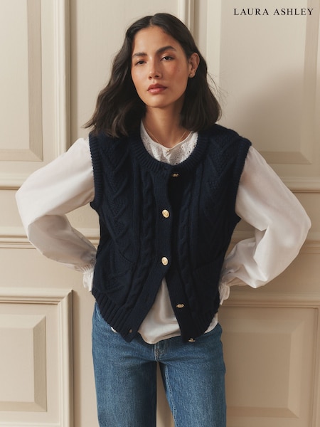 Laura Ashley Navy Blue Chunky Knitted Waistcoat Tank With Nautical Buttons with Wool