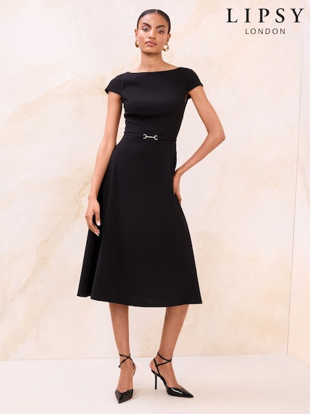 Lipsy Black Belted Historic Cap Sleeve Midi Dress