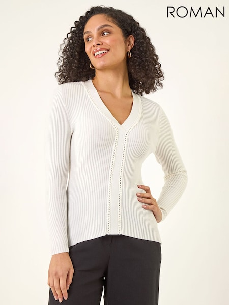 Roman White Ribbed V-Neck Cable Knit Jumper