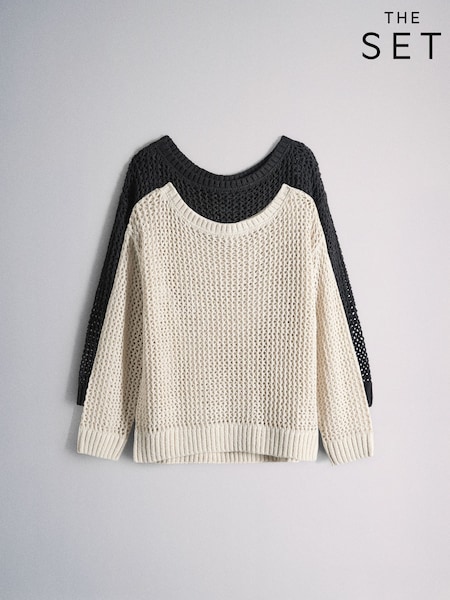 The Set 2 Pack Open Knit Slash Neck Jumpers Neutral/Black