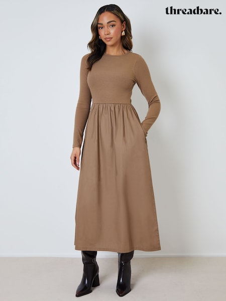 Threadbare Brown Rib Jersey 2-In-1 Midi Dress with Poplin Skirt
