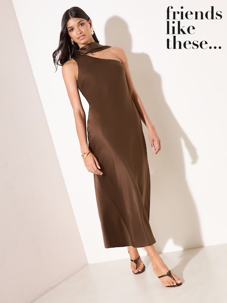 Friends Like These Brown Satin Scarf Midi Dress
