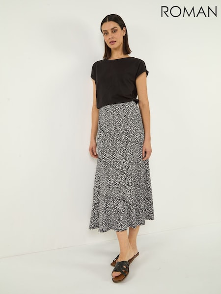 Roman Black Asymmetric Ditsy Print Midi Skirt
