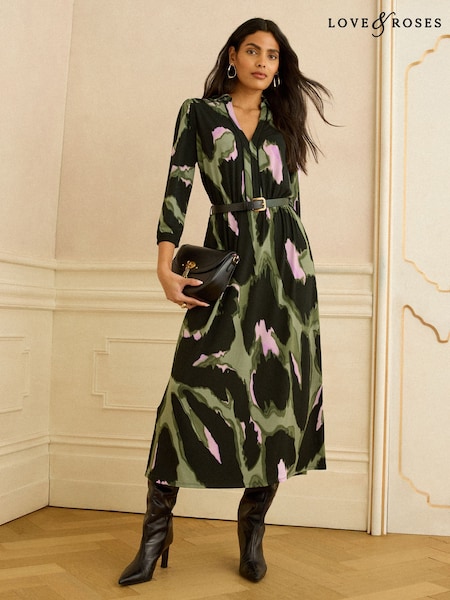 Love & Roses Khaki Green Animal Jersey Shirt Midi Dress
