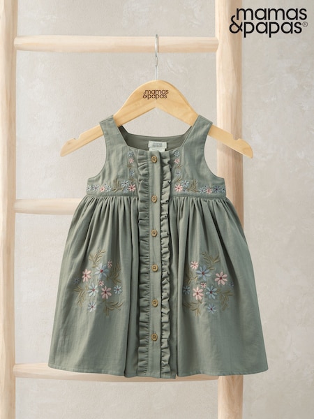 Mamas & Papas Green Floral Embroidered Pinafore Dress
