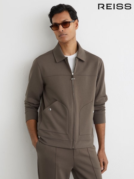 Reiss Light Brown Newland Premium Interlock Zip-Through Overshirt