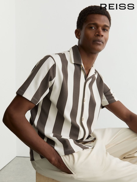 Reiss Brown/Off White Dexter Block-Stripe Cuban-Collar Shirt