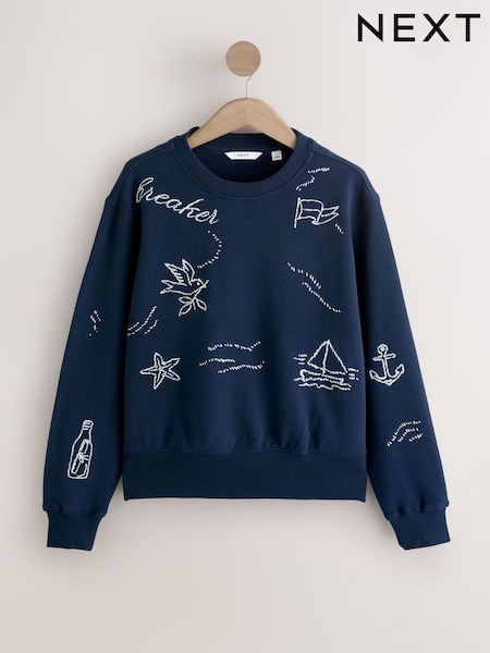 Navy Embroidered Sea Graphic Crew Neck Sweatshirt