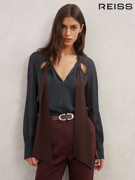 Reiss Navy/Burgundy Jasmine Tie-Neck Cut-Out Blouse