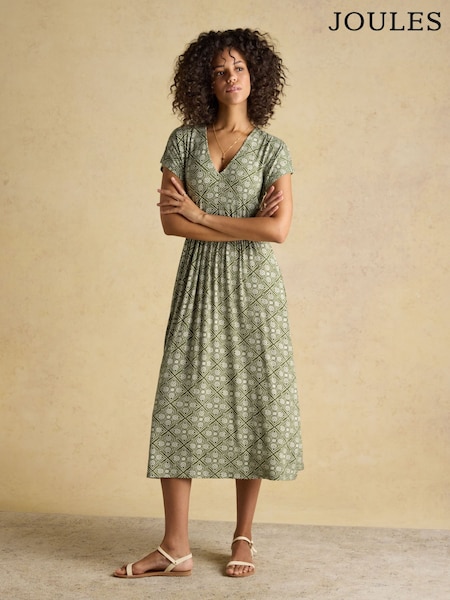 Joules Liliana Green Foulard Print Shirred V-Neck Midi Dress