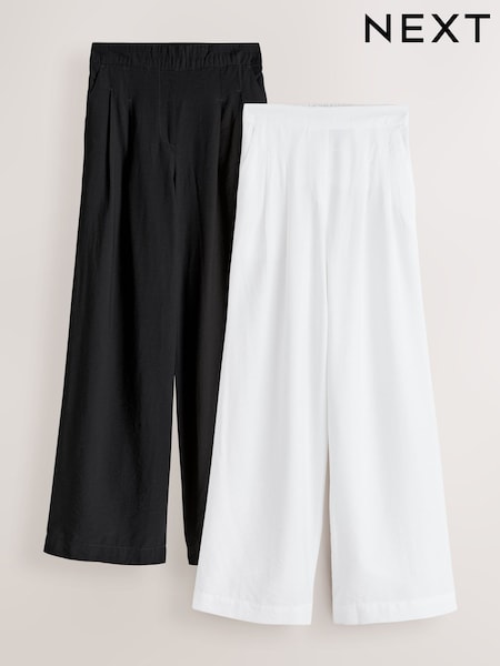 Black/White Pleated Wide Leg Trousers 2 Pack with Linen