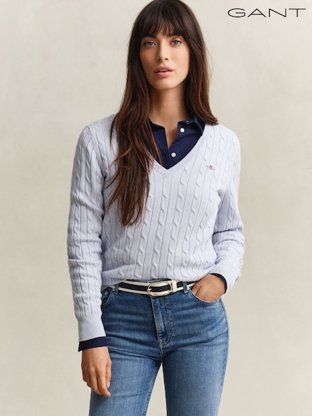 GANT Natural Stretch Cotton Cable Knit V-Neck Jumper