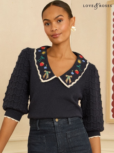 Love & Roses Navy Embroidered Collar Knitted Jumper
