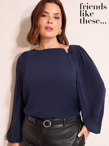 Friends Like These Navy Curve Long Sleeve Hardware Detail Drape Blouse