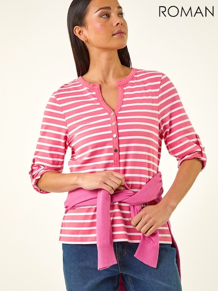 Roman Pink Petite Stripe V-Neck Button Top