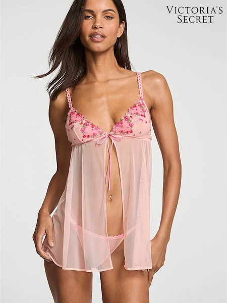 Victoria's Secret Hearts and Roses Pink Embroidered Babydoll Set