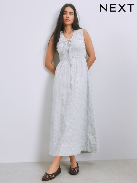 Blue/Ecru Pattern Stripe V-Neck Shirred Body Maxi Dress