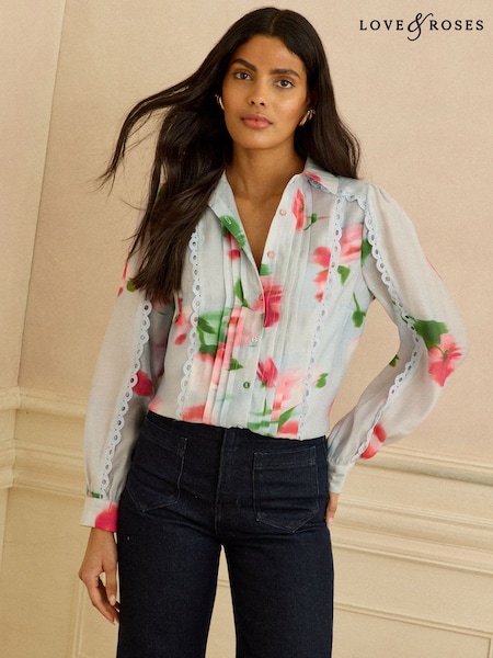 Love & Roses Blue Floral Long Sleeve Button Through Lace Trim Shirt