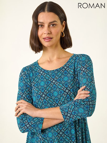 Roman Blue Printed Hanky Hem Tunic Top