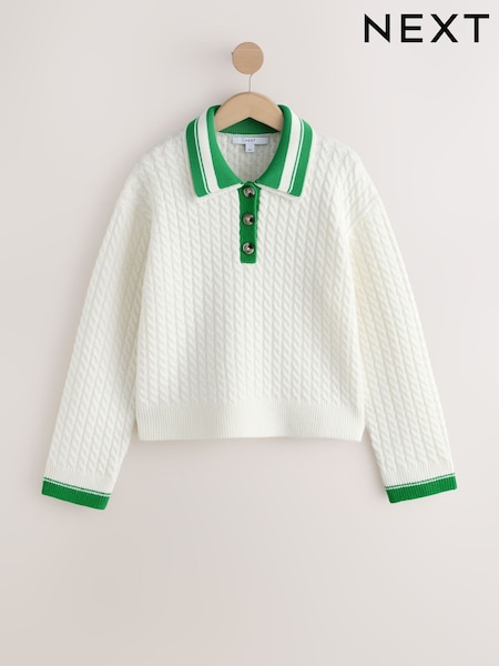 Ecru Cable Knit Double Collar Polo Jumper