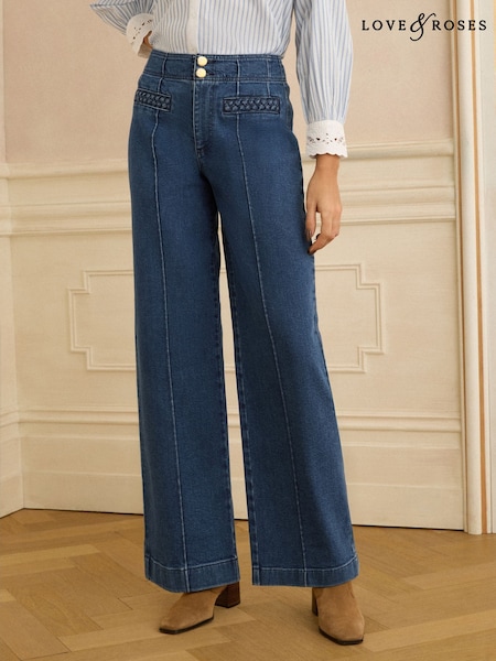Love & Roses Dark Blue Petite Wide Leg Plait Detail Denim Jeans