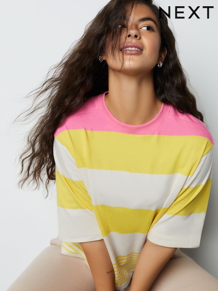 Yellow/Pink Stripe Relaxed Boxy Elbow Length Crew Neck T-Shirt
