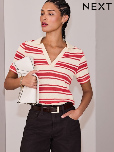 Red/Ecru Stripe Knitlook Short Sleeve Polo Shirt