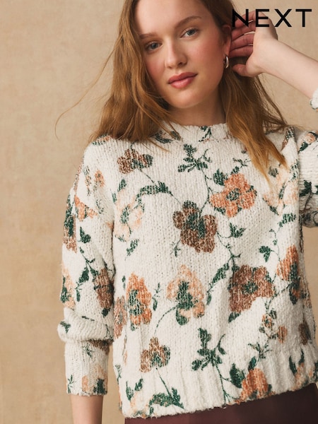 Ecru Floral Cotton Rich Slub Knit Jumper