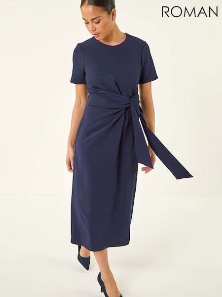 Roman Blue Petite Tie Waist Stretch Midi Dress