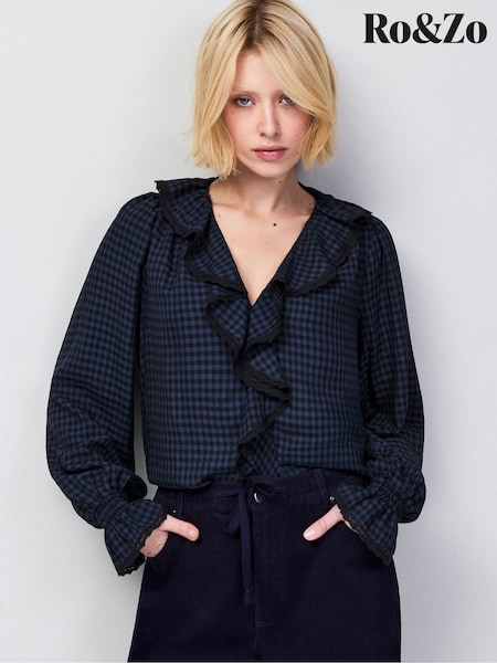 Ro&Zo Blue Check Ruffle Front Trim Detail Blouse
