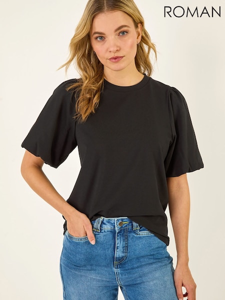 Roman Black Puff Sleeve Stretch T-Shirt