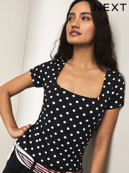 Black/Ecru Polka Dot Square Neck Short Sleeve Top