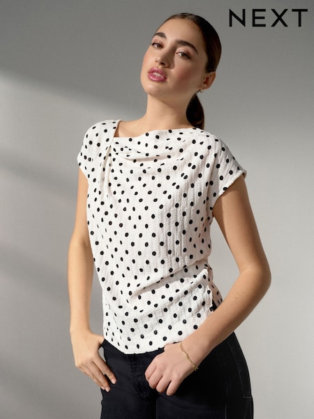 Black/Ecru Polka Dot Asymmetric Pleated Drape Short Sleeve Top