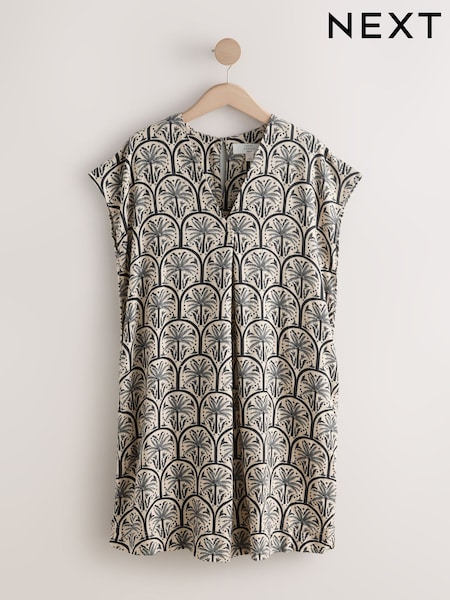 Black/White Palm Print Linen Blend Mini Short Sleeve V-Neck Kaftan Dress