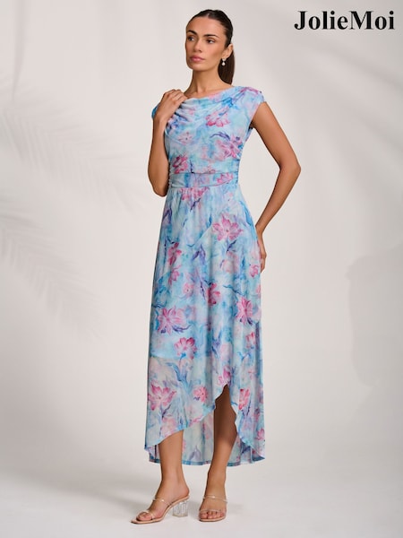 Jolie Moi Blue Asymmetric Draped Mesh Maxi Dress