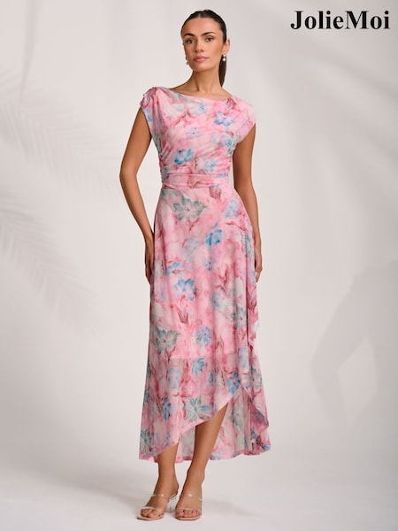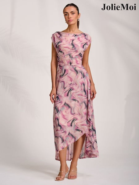 Jolie Moi Pink Asymmetric Draped Mesh Midaxi Dress