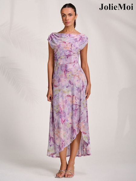 Jolie Moi Purple Asymmetric Draped Mesh Maxi Dress
